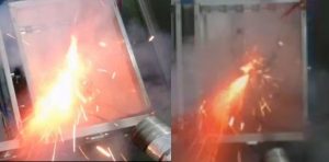 リチウムイオン蓄電池の発火試験により、消防法で定められた基準を満たしていることが確認された耐火構造を採用しています。万一内容品が発火しても、熱や炎が周りに広がりにくいため、延焼のリスクを大きく低減することができます。